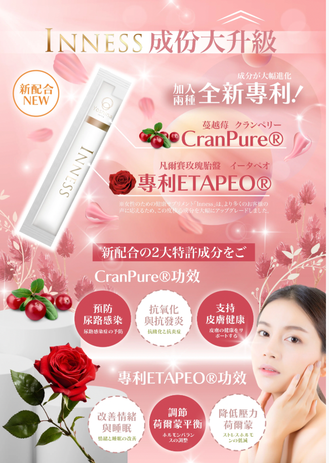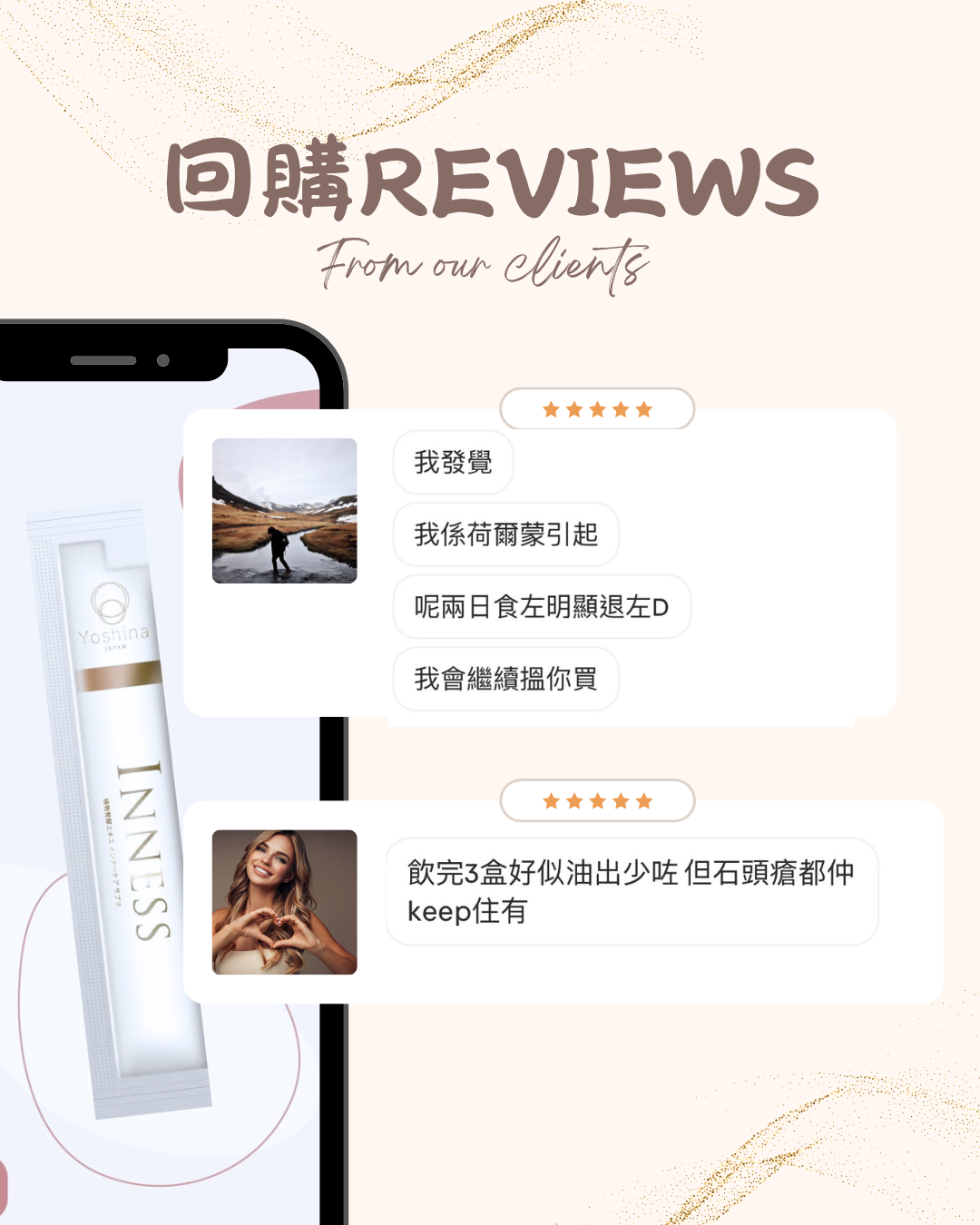 INNESS內服調理理念,調痘同時改善好女性內分泌問題,從內到外促進皮膚細胞生長,改善暗瘡暗粒問題。經期前或熬夜前服用INNESS袪痘飲,可以大大降低爆痘及生暗粒可能性。