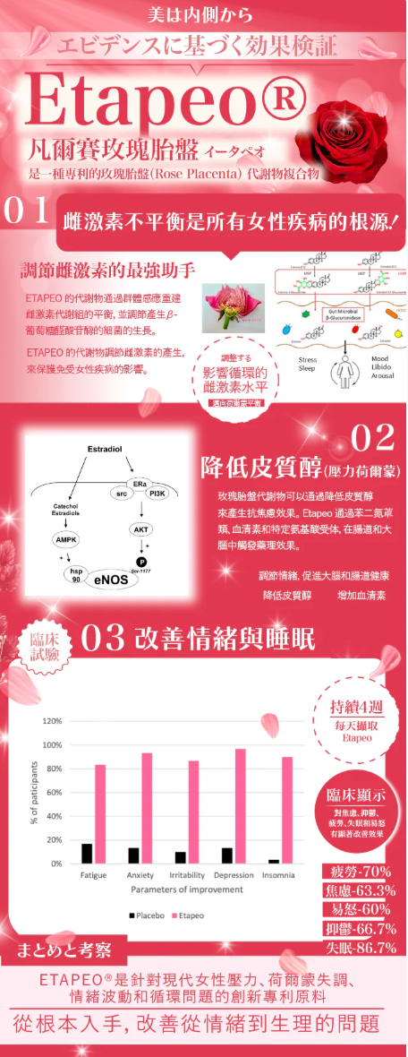 能有效改善女性內分泌失調及生理期不適症狀,如經痛,皮膚暗瘡、暗沉,抗氧化,體質虛弱及情緒問題。